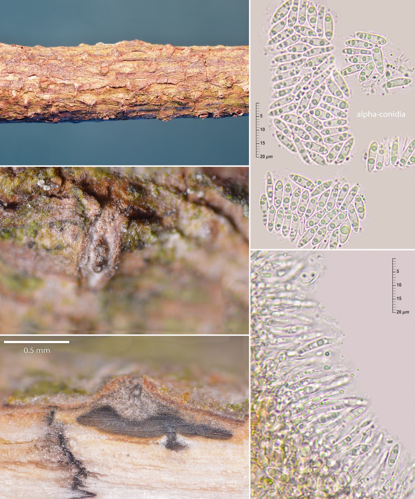 Picnidios, formadores de alfa-conidios, gregarios y pustulosos. Al parecer, la especie también puede formar beta-conidios filiformes y falciformes de 13-22 x 1,0-1,5 micras (WEHMEYER, 1933). La facies teleomórfica de este hongo, Diaporthe oncostoma, es muy frecuente en toda la región. Hasta hora, el hongo había sido considerado como saprobio o débilmente parásito de Robinia, pero estudios recientes parecen achacarle más patogenicidad como responsable de chancro y acronecrosis de esta planta.